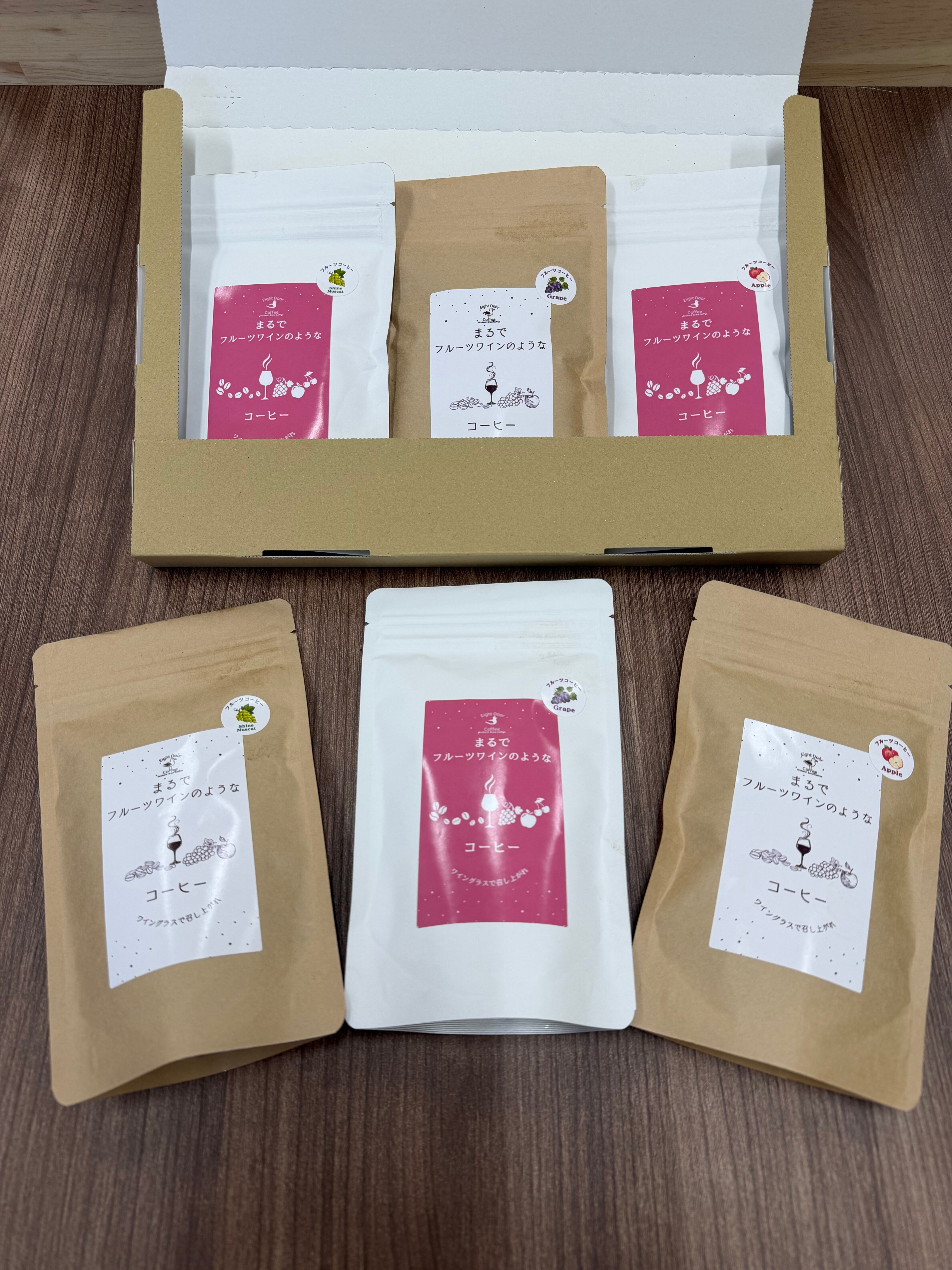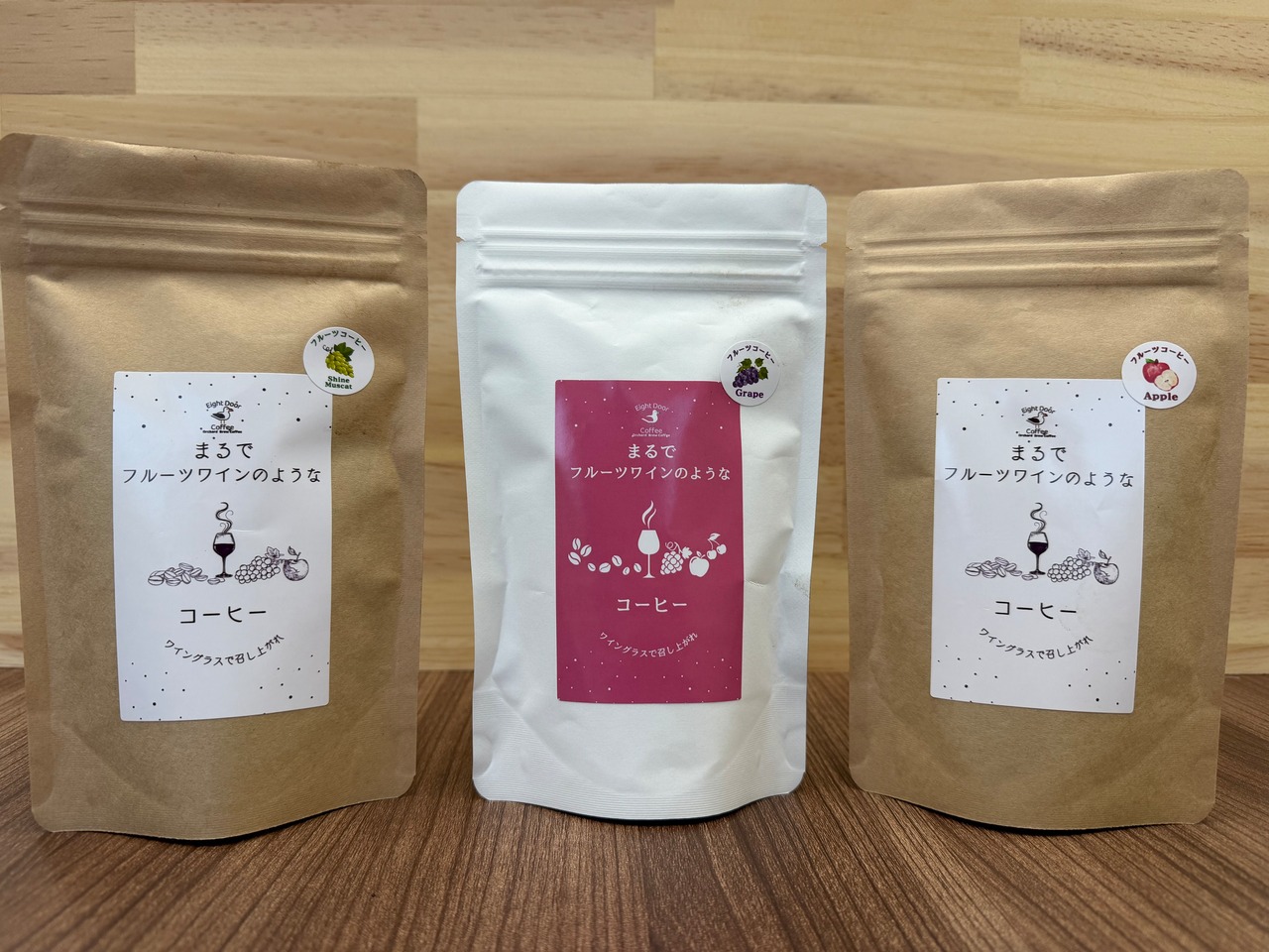 りんご・ぶどう・シャインマスカットの3種を、各50g+10g増量(発売記念キャンペーン)にしました。初めてフルーツコーヒーをご購入される方におすすめのセットです。